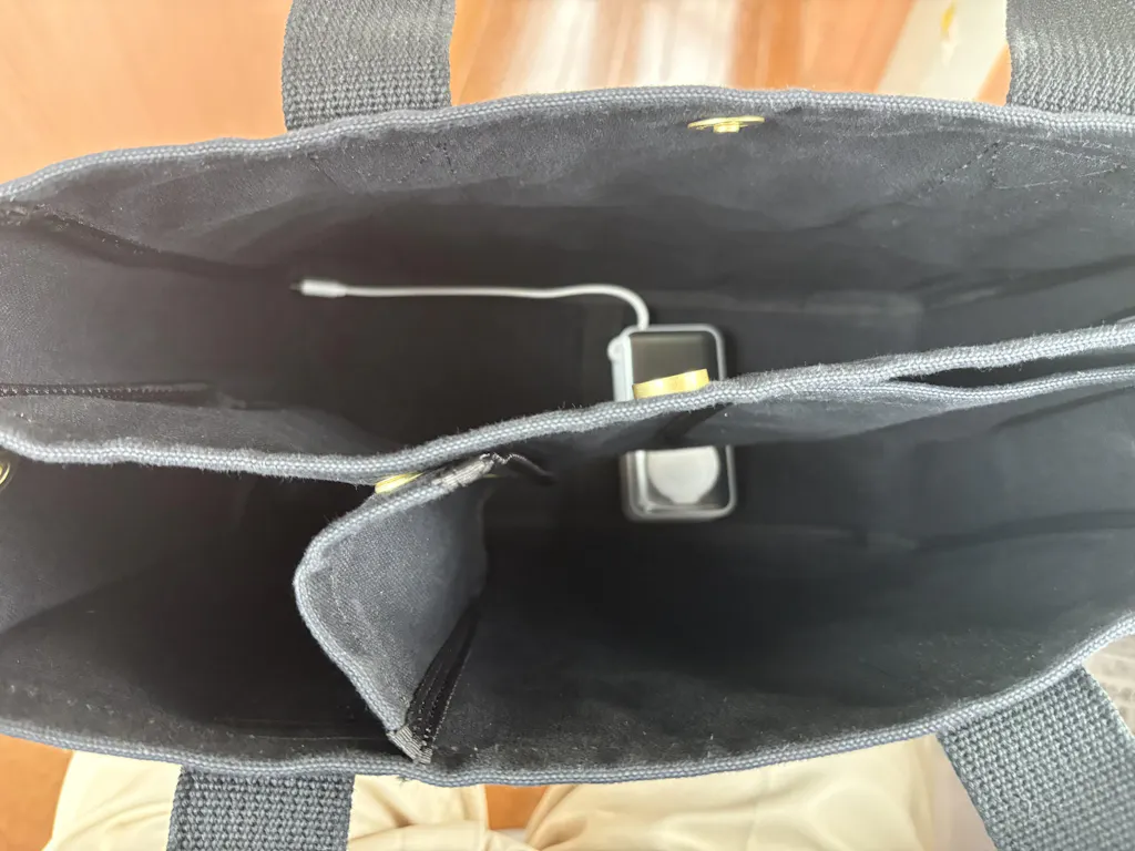 夏にぴったりの爽やかなバッグ。サイズ感も、大きすぎず、マチがあって結構入り、使いやすいです。ポケットが内側に付いているデザインが、スッキリしていてスマートです。傘やペットボトルを入れる時の間仕切りが付いていて、それも大変重宝です。
